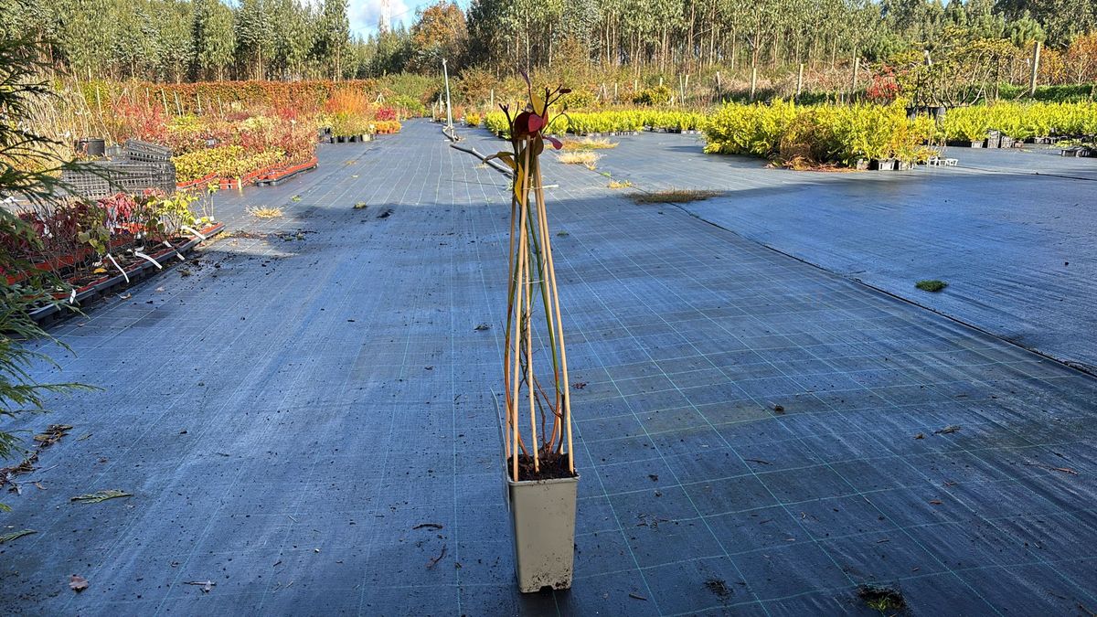 Sus tallos son leñosos y de hojas de color verde intenso que con la llegada del otoño adquieren tonos rojizos antes de su caída.
