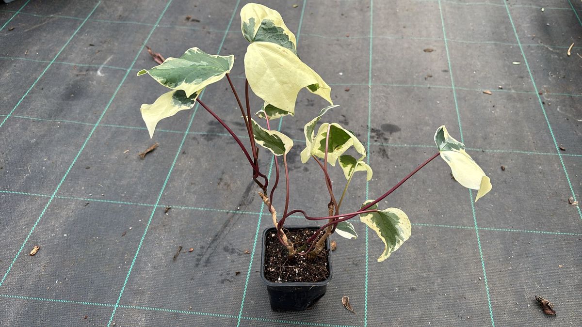 Trepadora perenne de rápido crecimiento. Hojas sutiles, grandes, verde intenso en el centro, más claro en las orillas, irregularmente rasgueado de blanco crema. Ramas provistas de raíces aéreas para pegarse a paredes. Cuando son adultas dan flores pequeñas verde-amarillentas en ramilletes que dan lugar a frutitos negros.