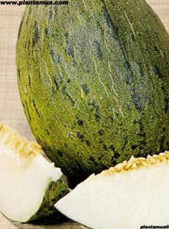Variedad con planta de porte medio que protege bien la cosecha. Frutos grandes de 2 a 3 kg. en forma ovalada y piel casi lisa con algunos surcos superficiales. De color verde claro y manchas verde oscuro. Carne blanca, compacta y dulce. Semillas redondas, con forma de piñón. Precocidad y conservación media. Ciclo aproximado de 105 a 110 días.